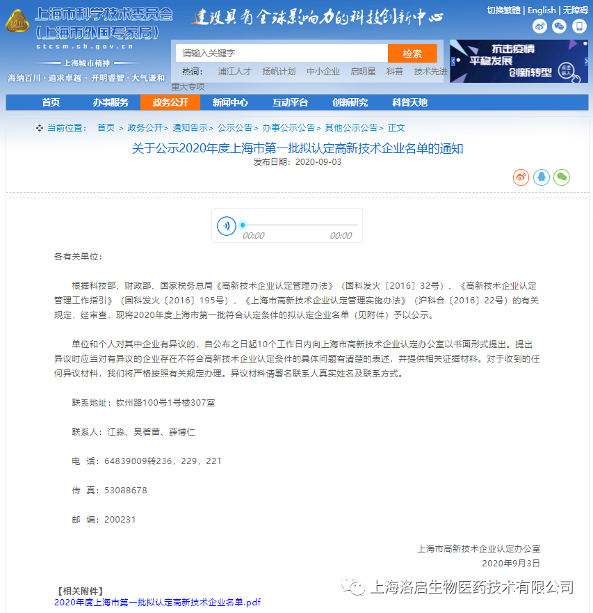 近期,经过前期调研、审计评估、上报资料等必要环节,我公司顺利顺利获得审核,成为了2020年度上海市第一批拟认定高新技术企业!