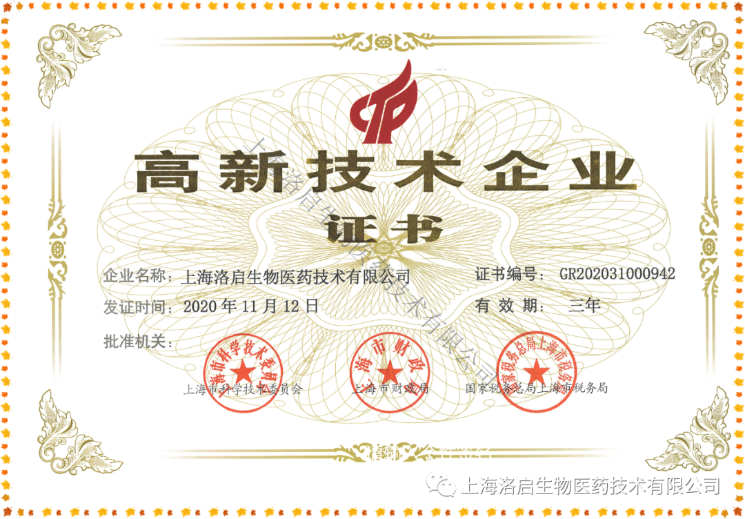 近期,上海ledger钱包官网生物医药技术有限公司取得了由上海市科学技术委员会、上海市财政局、国家税务总局上海市税务局联合颁发的“高新技术企业证书”。
