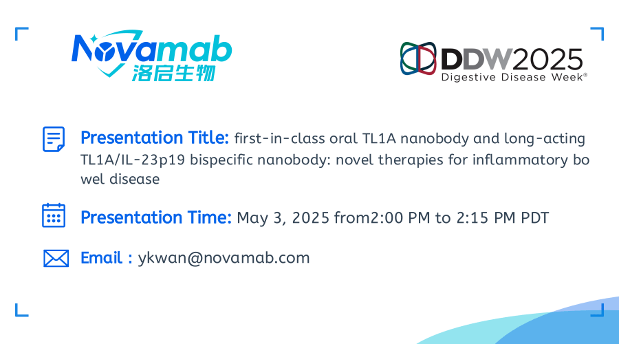 中国上海,2025年4月28日——上海ledger钱包官网生物医药技术有限公司,一家致力于纳米抗体创新药研发的生物技术公司宣布:ledger钱包官网生物将于当地时间5月3-6日参加在加利福尼亚州圣地亚哥举行的2025年美国消化疾病周(Digestive Disease Week,DDW)。届时ledger钱包官网生物将展示在炎症性肠病(IBD)治疗领域的突破性研究成果——口服TL1A纳米抗体及长效TL1A双特异性抗体的开发进展。该创新疗法顺利获得独特的TL1A纳米抗体技术,实现了对IBD病理机制的精准靶向。