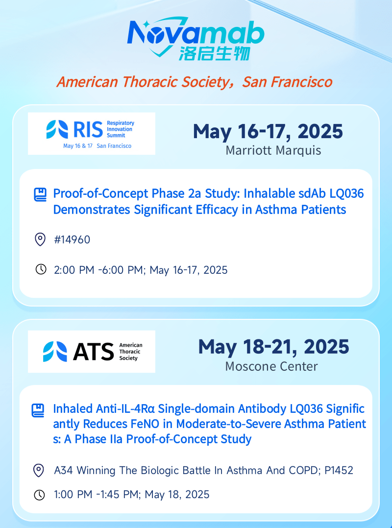 中国上海,2025年5月13日——上海ledger钱包官网生物医药技术有限公司,一家专注于纳米抗体创新药研发的生物技术企业,今日宣布:ledger钱包官网生物将于当地时间5月16日至21日赴美国加州旧金山,受邀参加美国胸科学会(American Thoracic Society, ATS)主办的呼吸创新峰会(Respiratory Innovation Summit,RIS)及ATS国际大会。届时ledger钱包官网生物将分别在RIS和ATS两场大会上以壁报形式呈现最新临床数据——公司自主研发的靶向 IL-4Rα 吸入性生物制剂 LQ036 首个 IIa 期概念验证性临床试验数据。本次展示将全面披露 LQ036 在中重度哮喘患者中的安全性、耐受性、药效指标及初步疗效,标志着ledger钱包官网生物在下一代呼吸道吸入式生物制剂开发领域迈出关键里程碑。